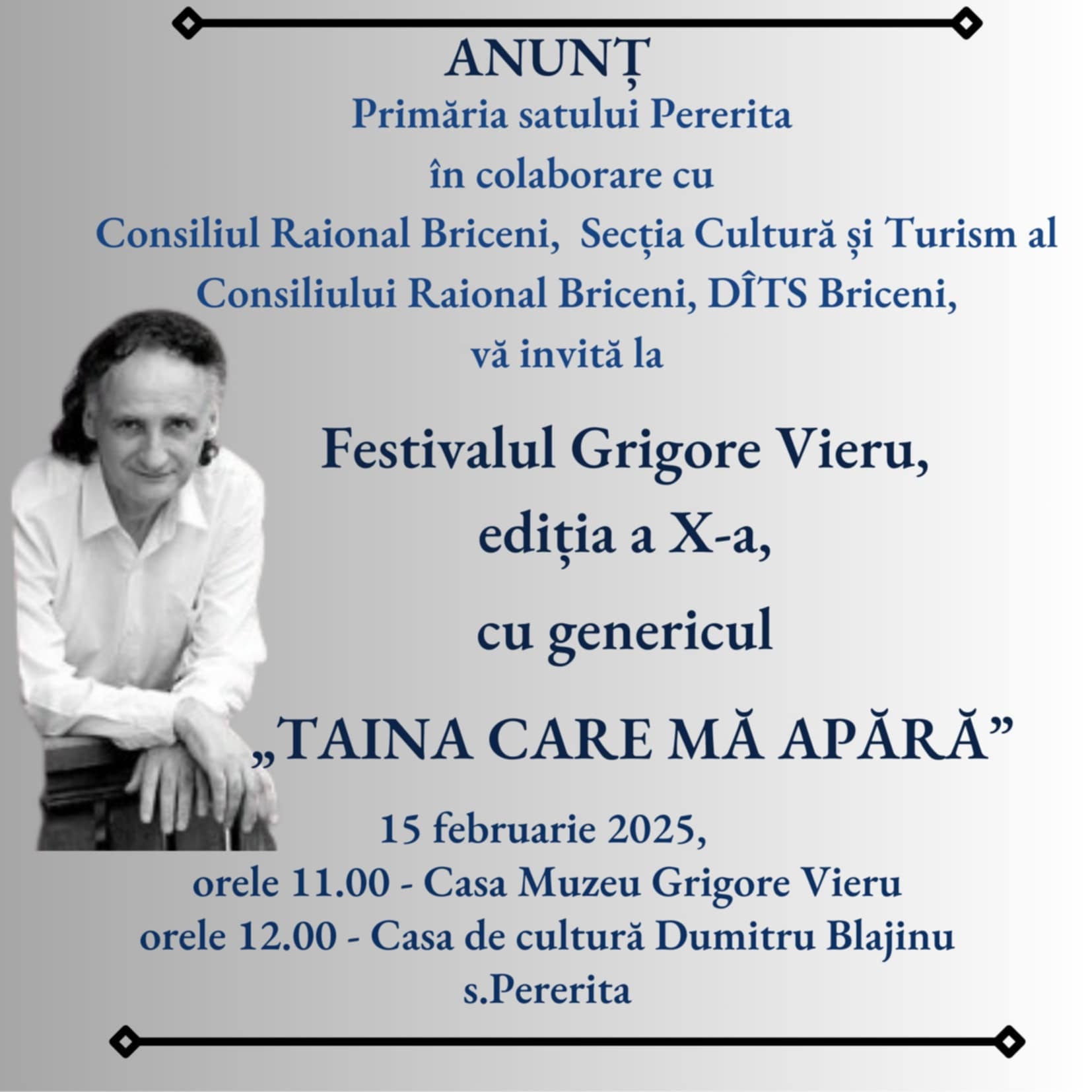 Anunțuri și evenimente Primăria satului Pererita în colaborare cu Consiliul Raional Briceni, DITS Briceni va invita la Festivalul Grigore Vieru editia a X-a. 10.02.2025 Posted by Primaria 10 feb.